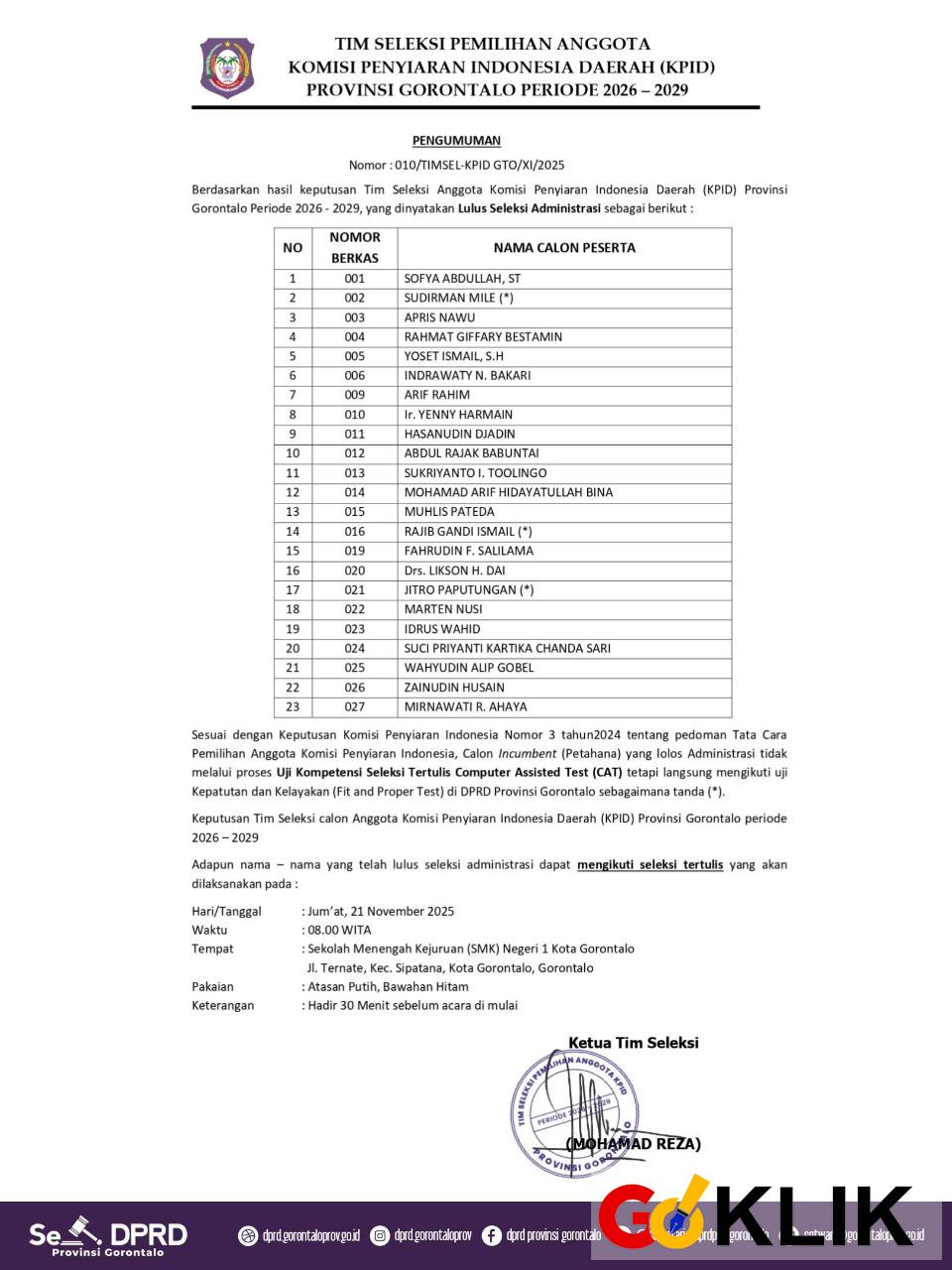 GoKLIK Gorontalo. Tim Seleksi Pemilihan Anggota Komisi Penyiaran Indonesia Daerah (KPID) Provinsi Gorontalo Periode 2026–2029 resmi mengumumkan nama nama 23 peserta yang dinyatakan lulus seleksi administrasi dan berhak melanjutkan ke tahap Uji Kompetensi Seleksi Tertulis Computer Assisted Test (CAT). Pengumuman tersebut tertuang dalam surat Nomor: 010/TIMSEL-KPID GTO/XI/2025. Dalam pengumuman yang ditandatangani Ketua Tim Seleksi, Mohamad Reza, peserta yang dinyatakan lolos administrasi terdiri dari 23 nama. Mereka berasal dari berbagai latar belakang profesi, termasuk akademisi, praktisi penyiaran, tenaga profesional, dan tokoh masyarakat. Dalam surat pengumuman tersebut juga menguraikan poin dimana Sesuai ketentuan Komisi Penyiaran Indonesia, seluruh peserta, dikecualikan tuga calon incumbent yang kembali mendaftar sebagaimana ketentuan KPI pusat, wajib mengikuti seleksi tertulis berbasis CAT sebelum memasuki tahapan uji kepatutan dan kelayakan (fit and proper test) di DPRD Provinsi Gorontalo. Adapun pelaksanaan ujian CAT sesuai isi pengumuman nantinya akan digelar pada Jumat, 21 November 202, mulai Pukul 08.00 WITA di SMK Negeri 1 Kota Gorontalo, Jl. Ternate, Kec. Sipatana. Dengan ditetapkannya nama-nama tersebut, Tim Seleksi berharap seluruh peserta mengikuti tahapan selanjutnya sebagaimana ketentuan yang telah diumumkan.